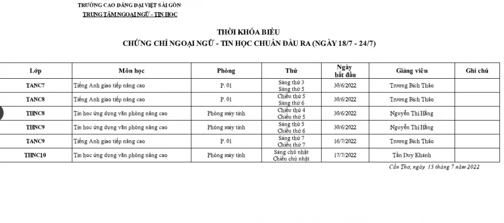Thời Khóa Biểu Chứng Chỉ Ngoại Ngữ - Tin Học Chuẩn Đầu Ra Từ 18/7/2022 - 24/7/2022