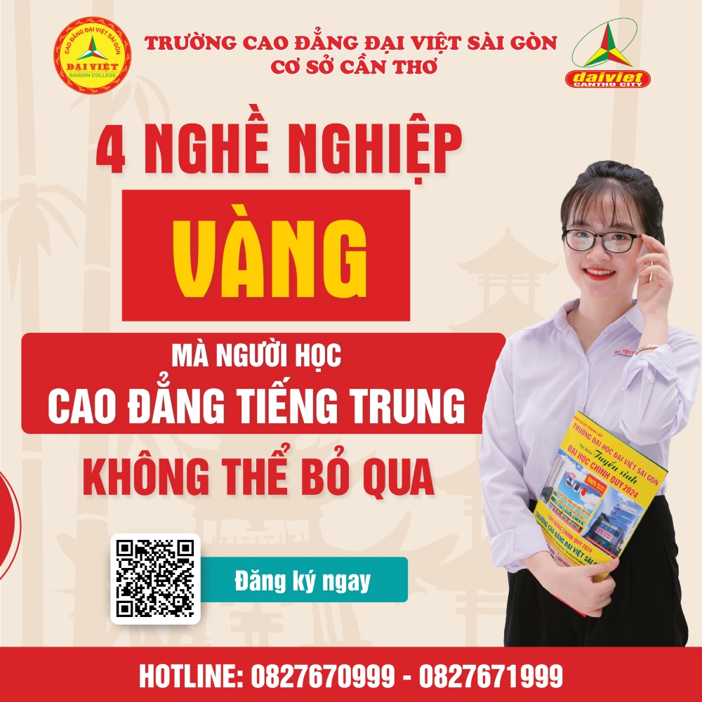 Trường Cao đẳng Đại Việt Sài Gòn cơ sở Cần Thơ với nhiều năm kinh nghiệm đào tạo ngành Cao đẳng Tiếng Trung , với chương trình bám sát thực tế cùng với đội ngũ giảng viên tận tâm, giàu kinh nghiệm sẽ là lựa chọn phù hợp cho các bạn