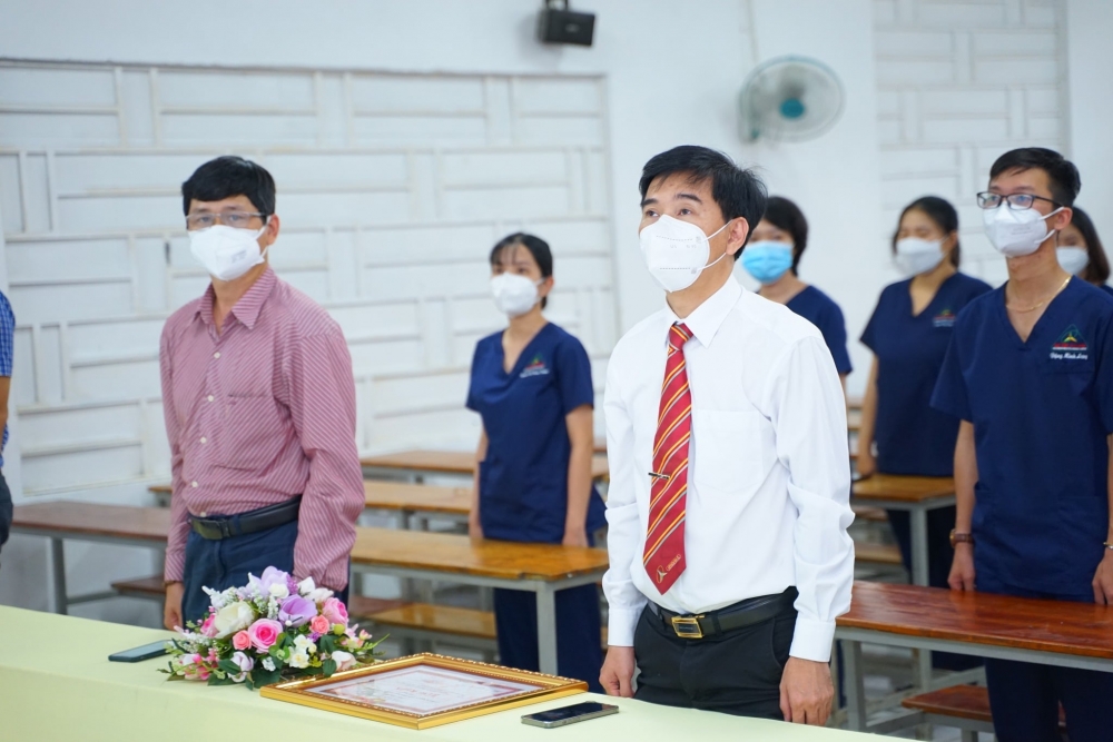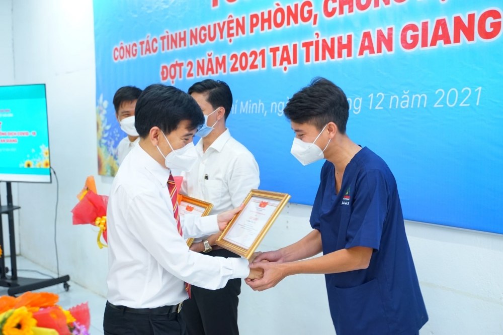 ?Trong buổi lễ Tổng kết công tác tình nguyện phòng, chống dịch Covid-19 đợt 2 tại tỉnh An Giang, TS. Lê Lâm - Hiệu trưởng Nhà trường trao bằng khen, tuyên dương các chiến sĩ đã hoàn thành tốt nhiệm vụ Tổ quốc giao.