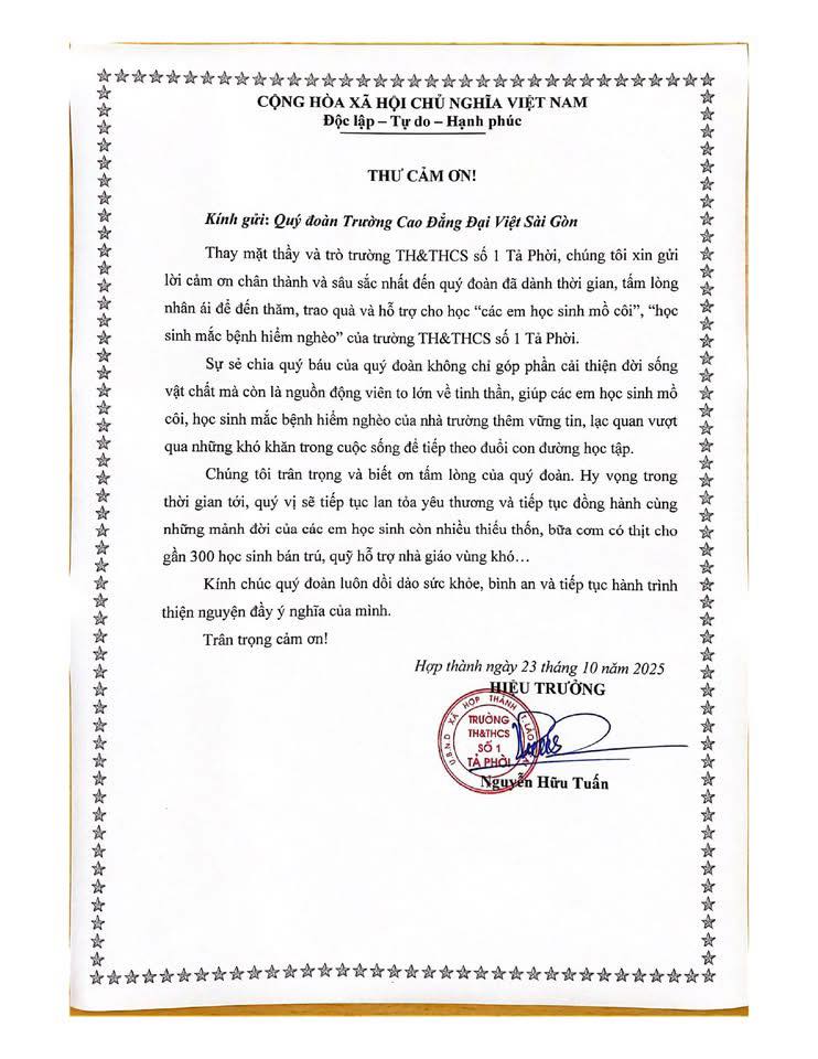 Ban Giám hiệu Trường Tiểu học Trung học Cơ sở số 1 Tả Phời đã gửi lời cảm ơn sâu sắc đến đoàn công tác Trường Đại Việt sự quan tâm, chia sẻ và hỗ trợ thiết thực dành cho các em học sinh có hoàn cảnh khó khăn.