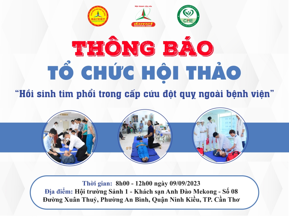 Nhằm đáp ứng nhu cầu cập nhật kiến thức, chia sẽ kinh nghiệm và huấn luyện kỹ năng về "HỒI SINH TIM PHỔI TRONG CẤP CỨU ĐỘT QUỴ" cho các cán bộ y tế, doanh nghiệp hoạt động trong lĩnh vực y tế, người học khác có quan tâm trên địa bàn TP. Cần Thơ. Trung tâm Đào tạo và Bồi dưỡng nhân lực y tế - Trường Cao đẳng Đại Việt Sài Gòn phối hợp với Trường Trung cấp Đại Việt Thành Phố Cần Thơ tổ chức Hội thảo chuyên đề “Hồi sinh tim phổi trong cấp cứu đột quỵ ngoài bệnh viện”