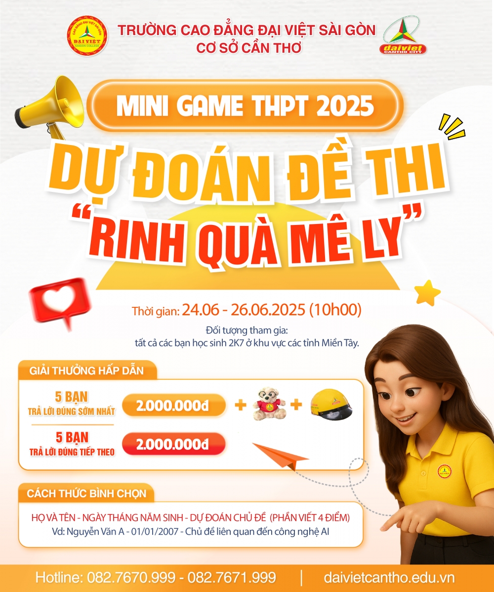*Lưu ý : Dưới mỗi bài viết đều gắn hagtag : #daivietcantho #minigame , check in ở Trường Cao Đẳng Đại Việt Cần Thơ. Mỗi tài khoản chỉ được gửi dự đoán 1 lần và không được chỉnh sửa và phải chụp lưu lại dự đoán của mình. khi có kết quả nếu trúng thưởng gửi hình ảnh câu trả lời đã chụp khi bình luận vào page Cao Đẳng Đại Việt Sài Gòn cơ sở Cần Thơ để trường xác nhận.