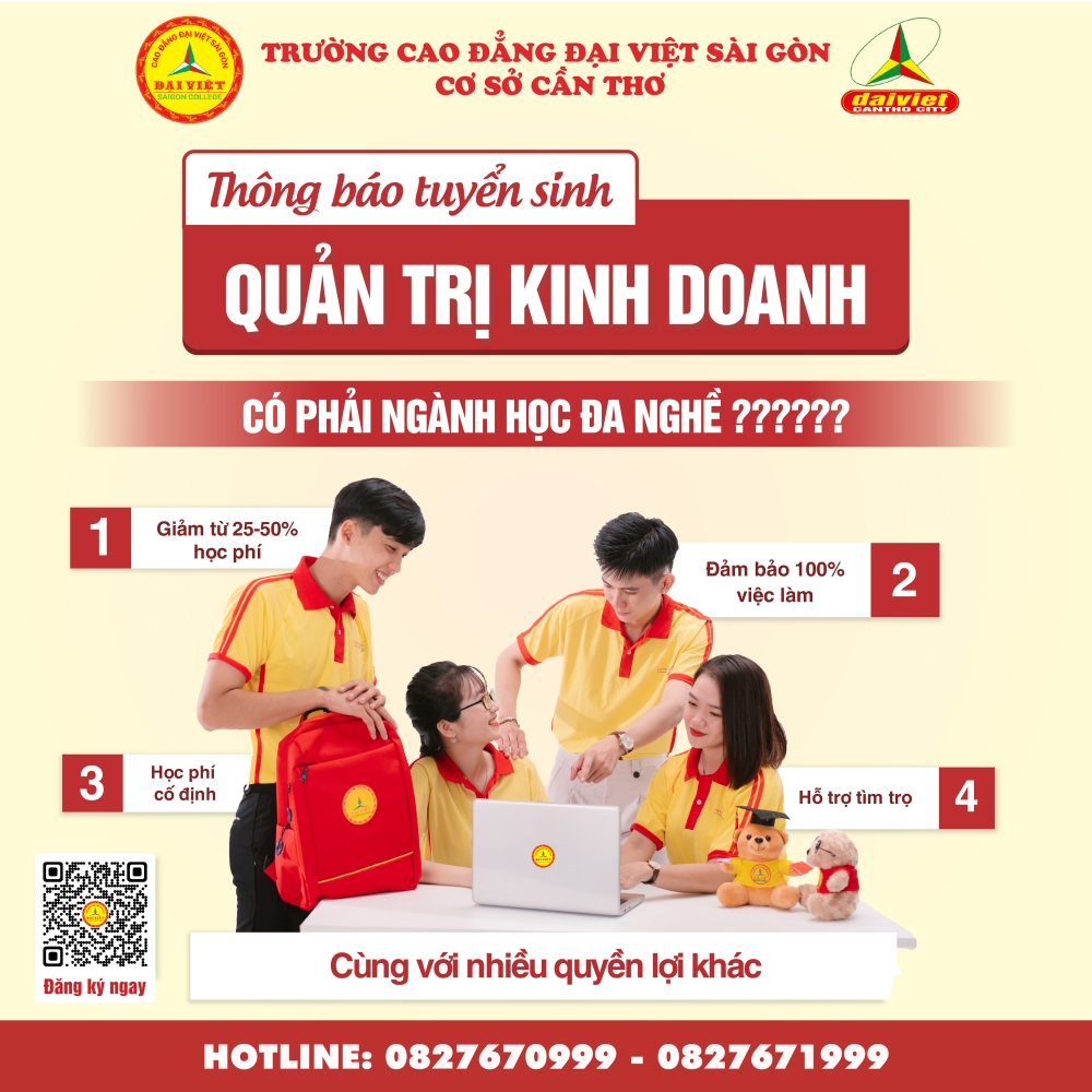 Tại Trường Cao Đẳng Đại Việt Sài Gòn cơ sở Cần Thơ đang đào tạo và tuyển sinh Quản Trị Kinh Doanh. Với chương trình học trang bị đầy đủ kiến thức và song song với thực hành. Mang đến cho sinh viên những kiến thức và trải nghiệm tốt nhất giúp bạn vững bước trong tương lai.