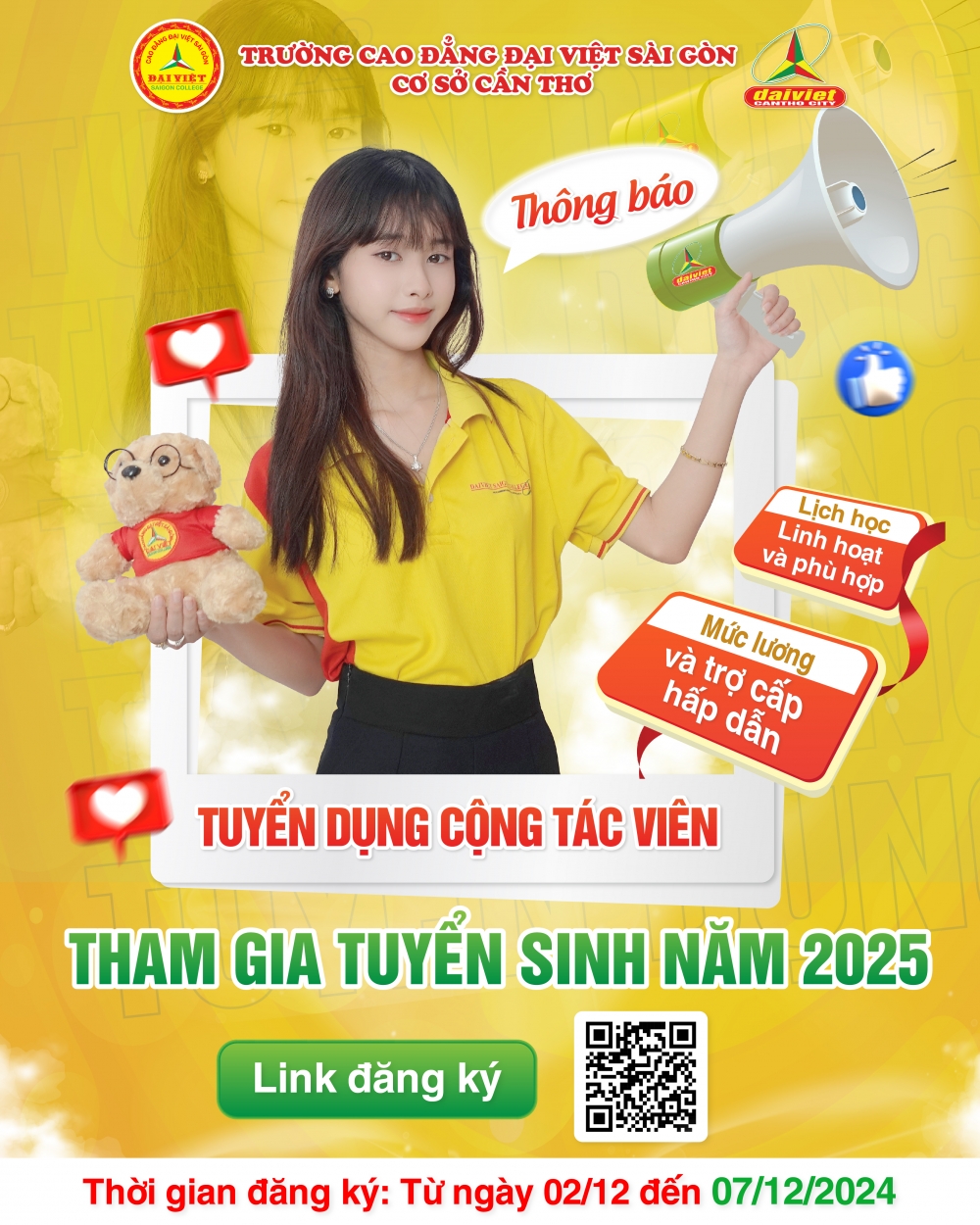 Phòng tuyển sinh - Truyền thông Trường Cao Đẳng Đại Việt Sài Gòn cơ sở Cần Thơ thông báo tuyển dụng Cộng tác viên tham gia công tác Tuyển sinh tư vấn hướng nghiệp.