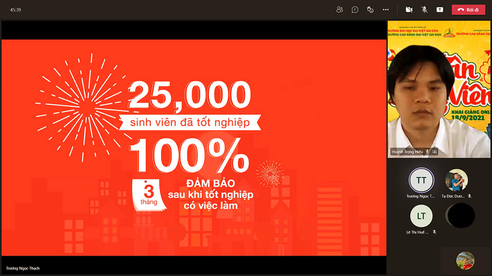 Sáng nay ngày 18/9 trường Cao Đẳng Đại Việt Sài Gòn cơ sở Cần Thơ liên kết đã tổ chức lễ khai giảng đợt 5 năm học 2021-2022 qua hình thức khai giảng online. Tại buổi khai giảng đã có sự tham dự nhiệt tình của Ban Giám Hiệu các Khoa và phòng ban, Quý Thầy Cô trong Hệ thống giáo dục Đại Việt và hơn 300 bạn sinh viên tham dự.