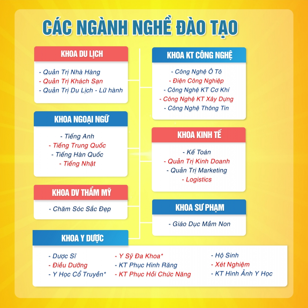- Khoa Kỹ Thuật - Công Nghệ: Công nghệ Ô tô, Điện Công nghiệp, Công nghệ Kỹ thuật Cơ khí, Công nghệ Thông tin...