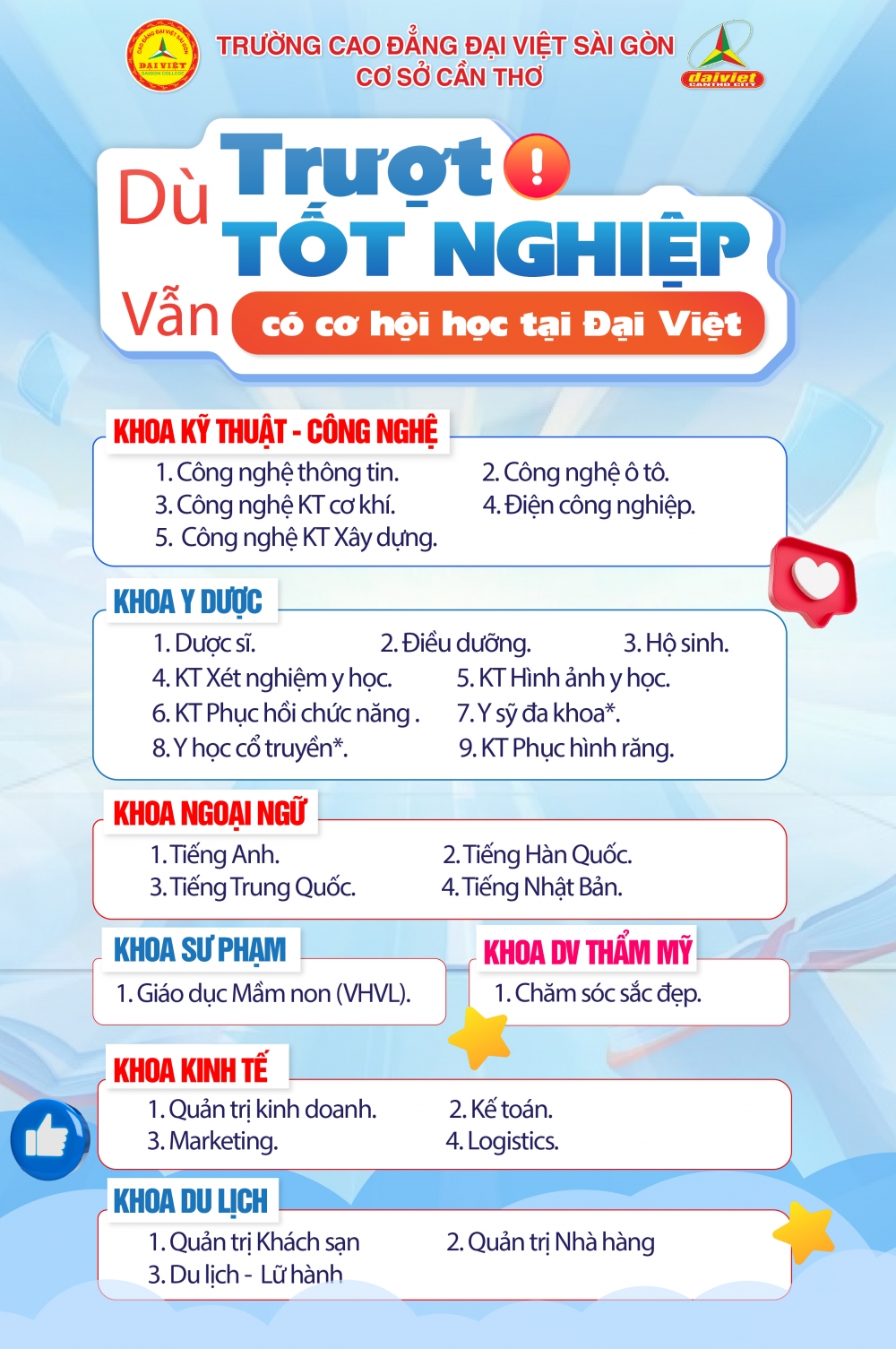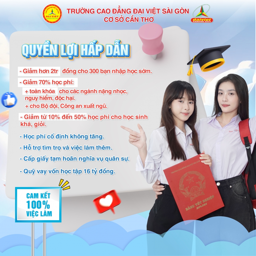 Còn những bạn học sinh hơi thiếu một xíu may mắn trượt tốt nghiệp THPT Quốc gia 2025 cũng đừng lo trường Cao đẳng Đại Việt cơ sở Cần Thơ vẫn luôn chào đón các bạn trở thành tân sinh viên của trường Đại Việt.